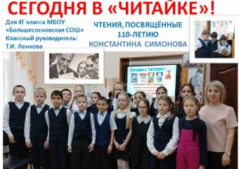 Литературные встречи в детской библиотеке, посвященные творчеству К. Симонова продолжаются. Отличным собеседником сегодня оказался 4В класс (кл. рук. Т.Л. Базуева) МБОУ "Большесосновская СОШ"